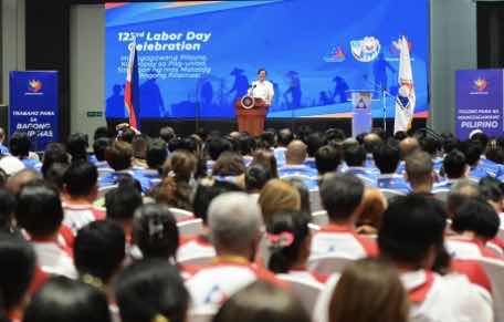 President Ferdinand “Bongbong” Marcos Jr. delivers the keynote message at the Labor Day Job Fair main event at the SMX Convention Center Manila last May 1, 2025.